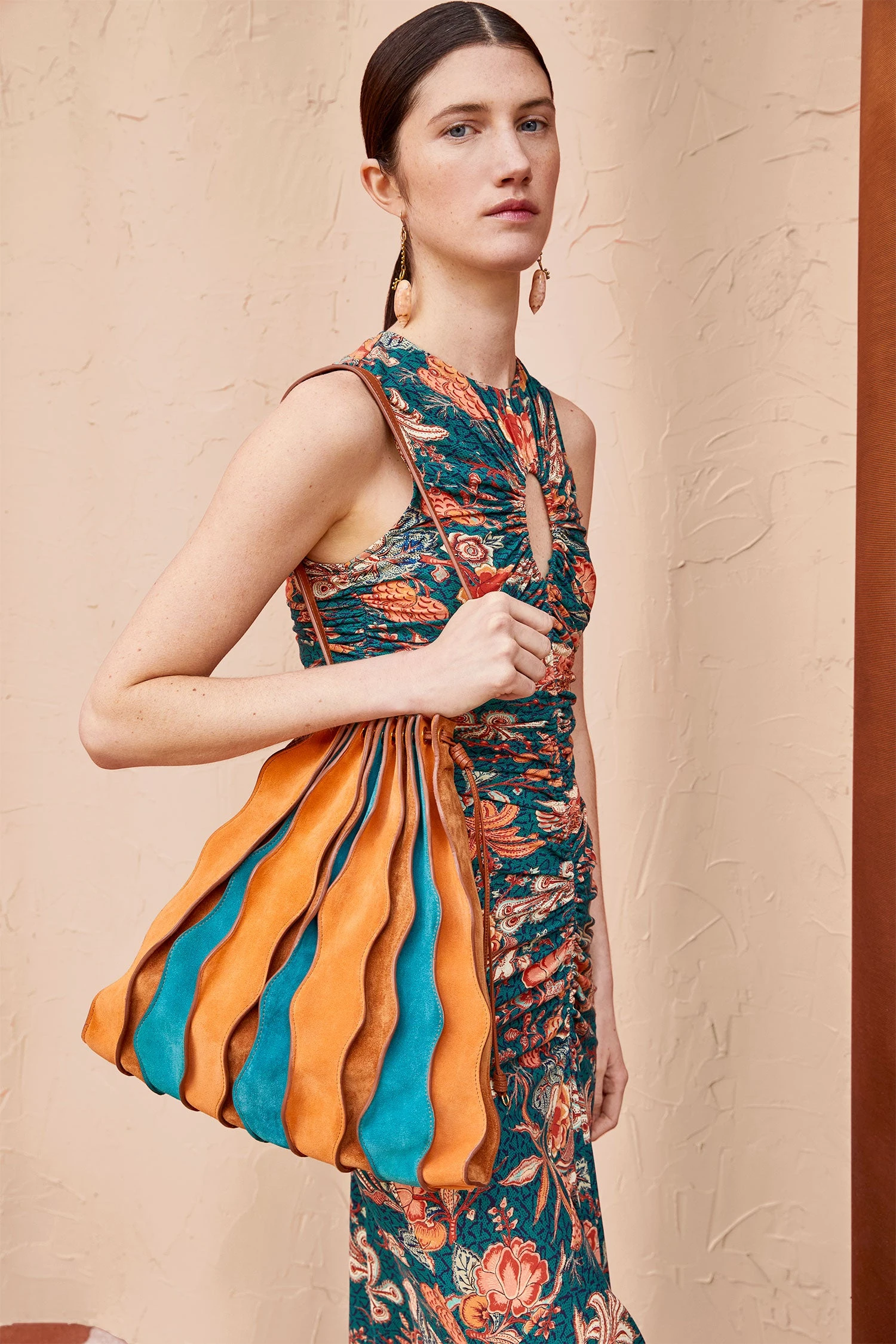 As featured in Look 28 of our Pre-Fall ’23 Lookbook, the Adria Large Pleated Wave Bag is a gorgeous new addition to our handbag collection, defined by undulating seams that adorn its sumptuous suede exterior in richly hued orange, sienna and blue colorblock. This luxurious shoulder bag has a long shoulder strap and features a drawstring closure that’s finished with our signature brass rings and leather knots.