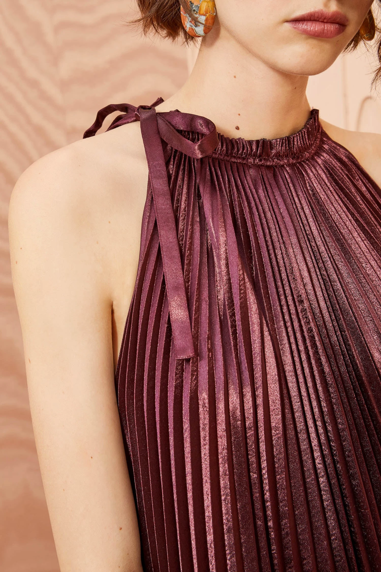 As featured in Look 20 of our Autumn/Winter ’23 Runway Show, our Amiko Dress is made from lustrous dark red satin that has been pleated into delicate ripples which expand and contract with movement. Cut in a stunning trapeze-style silhouette, this midi-length dress has an optional belt and is finished with an asymmetric neckline tie closure.