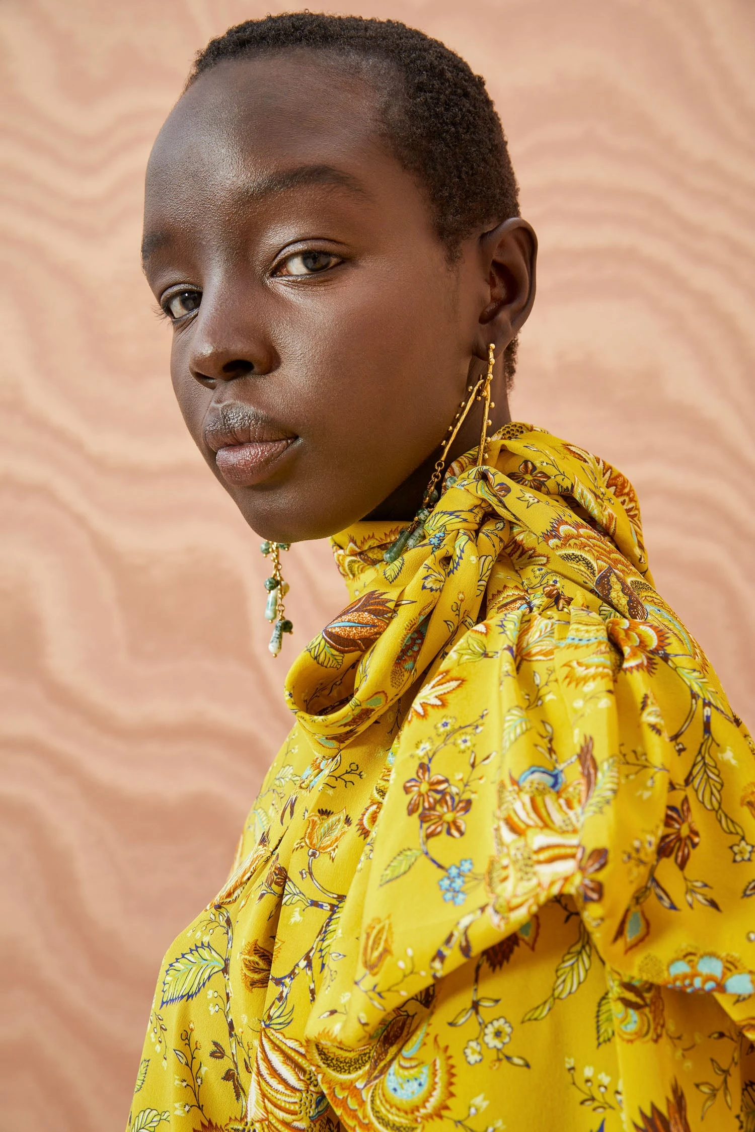 Made from our luxurious silk crepe de chine, the Brea Blouse is a rich yellow hue that comes alive with vintage-inspired orange blossom florals. This stunning blouse has a loose silhouette framed by long voluminous sleeves and is finished with lovely scarf-like neckties.Â