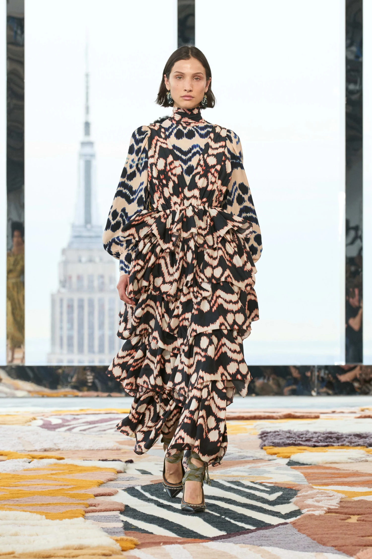 An Ulla Johnson exclusive only available in our stores or on our website, the Dephne Dress is made from silk taffeta printed in a graphic ikat-inspired stripe. This gorgeous cream and black dress features a midi-length ruffle skirt with bubble-edged tiers reminiscent of peony petals. It has a deep V-neckline and side-seam zipper.