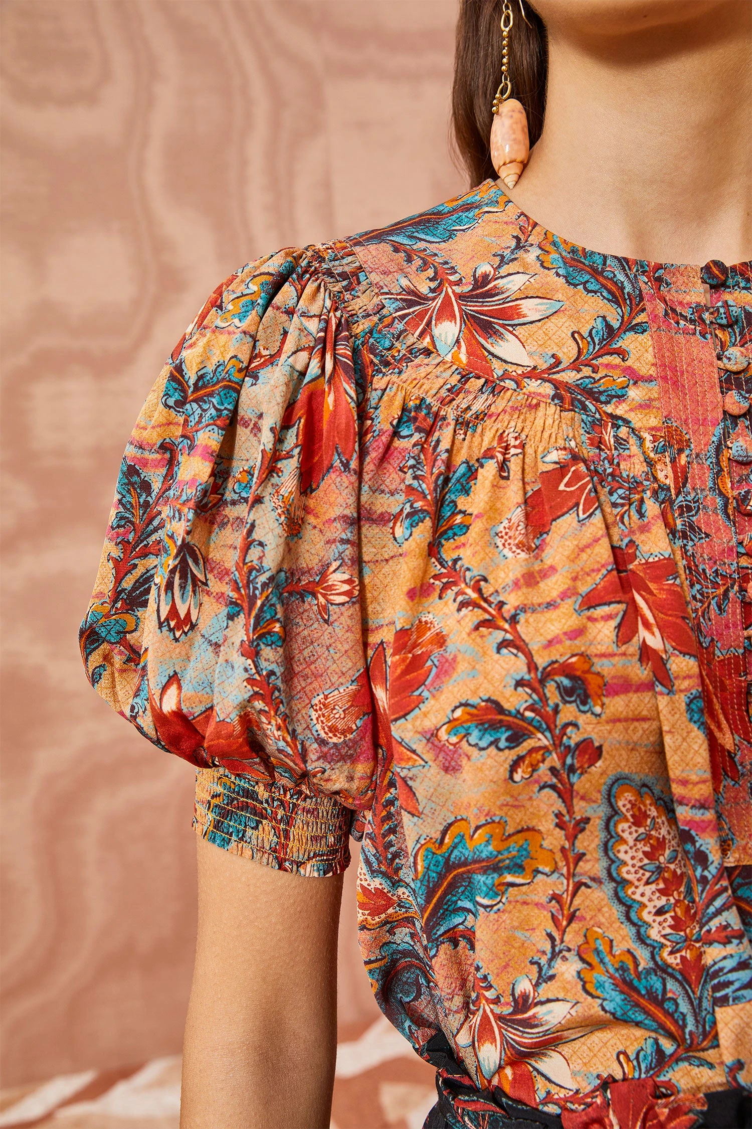 This Dina Top is crafted in orange, red and blue floral print crepe de chine and features short puff sleeves with trapunto-stitch detailing, a rounded bib collar and a button-up front panel.