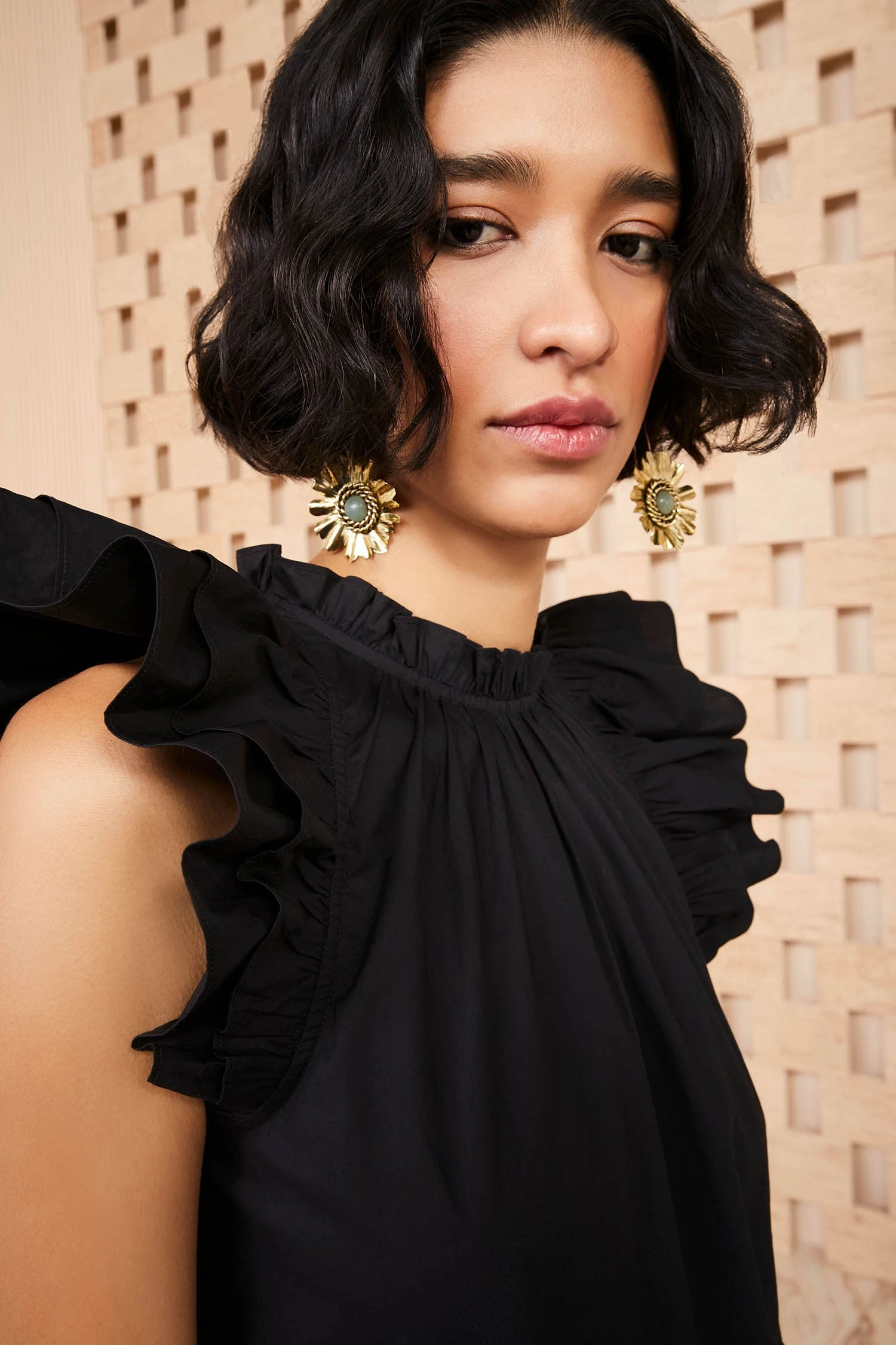 The Eden Dress is the perfect warm-weather frock, cut in airy soft cotton poplin. Gathered flutter sleeves add a bit of drama and are complemented by a mini ruffled neckline. This dress features pockets and is unlined.