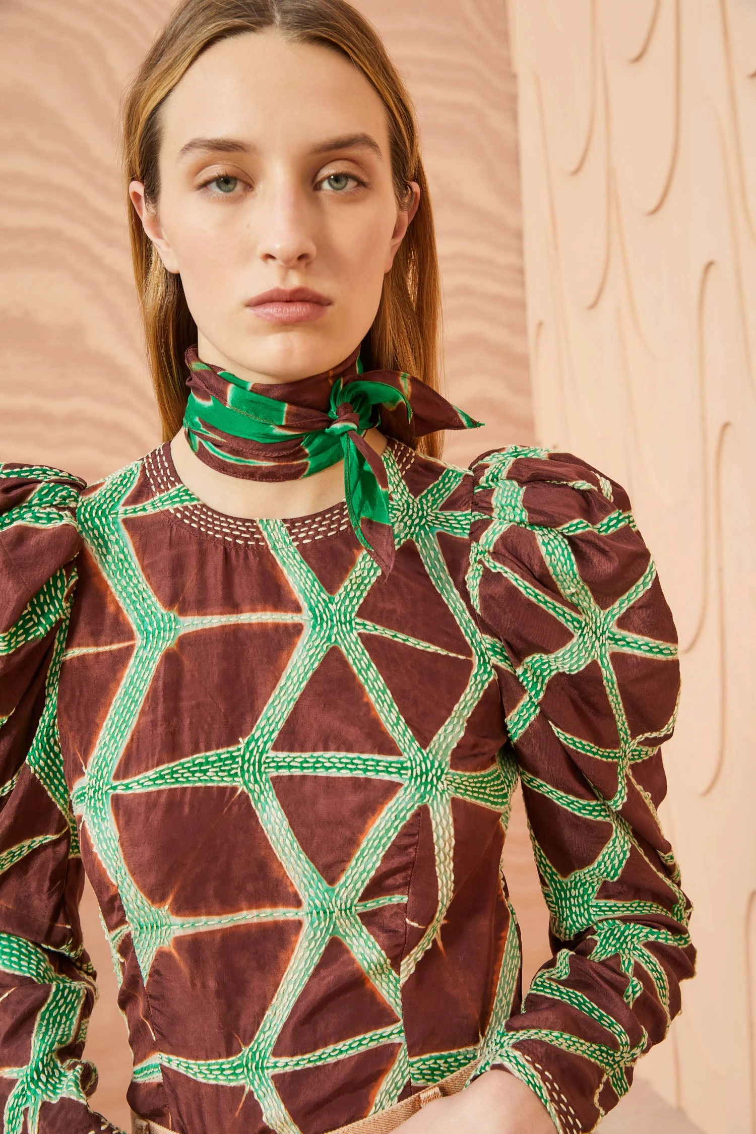 An Ulla Johnson exclusive only available in our stores or on our website, the Ema Scarf is an ascot style made from 100% silk expertly hand-dyed with a geometric pattern by women artisans in Bangalore. This rich brown and bright emerald beauty can be tied elegantly around the neck, threaded through your hair, or as an adornment to a favorite handbag.