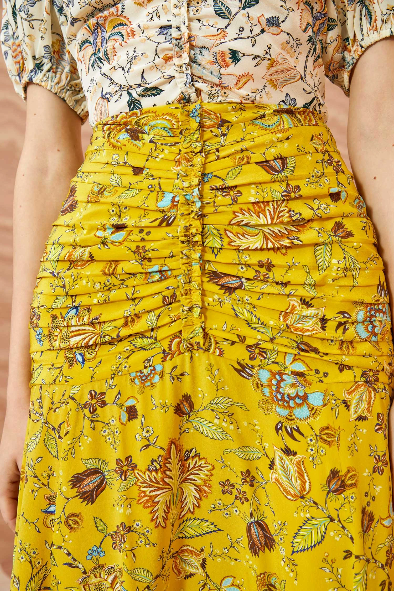 The Imani Skirt is an ultra-elegant silhouette crafted from our lustrous silk crepe de chine. This gorgeous yellow floral midi skirt has graceful ruching and delicate ruffles that define the flattering high waist. It is finished with a hidden center-back zipper.