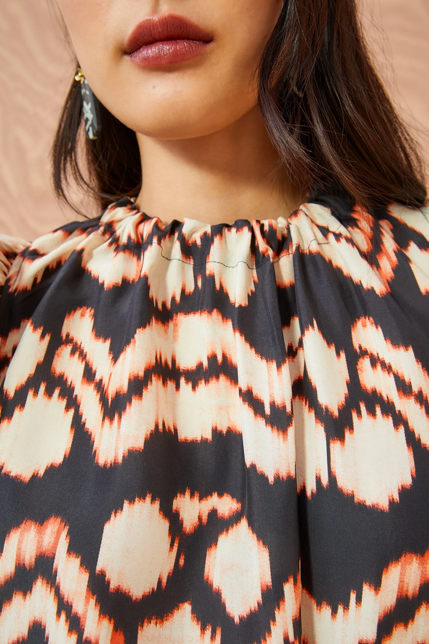 A standout print from our Autumn/Winter ’23 collection, the Iren Top is saturated in our painted ikat motif with cream graphics against a black backdrop. It is framed by voluminous flutter sleeves, has a loose silhouette, and a tie-fastening keyhole at the back. Wear yours with one of our handmade denim styles.