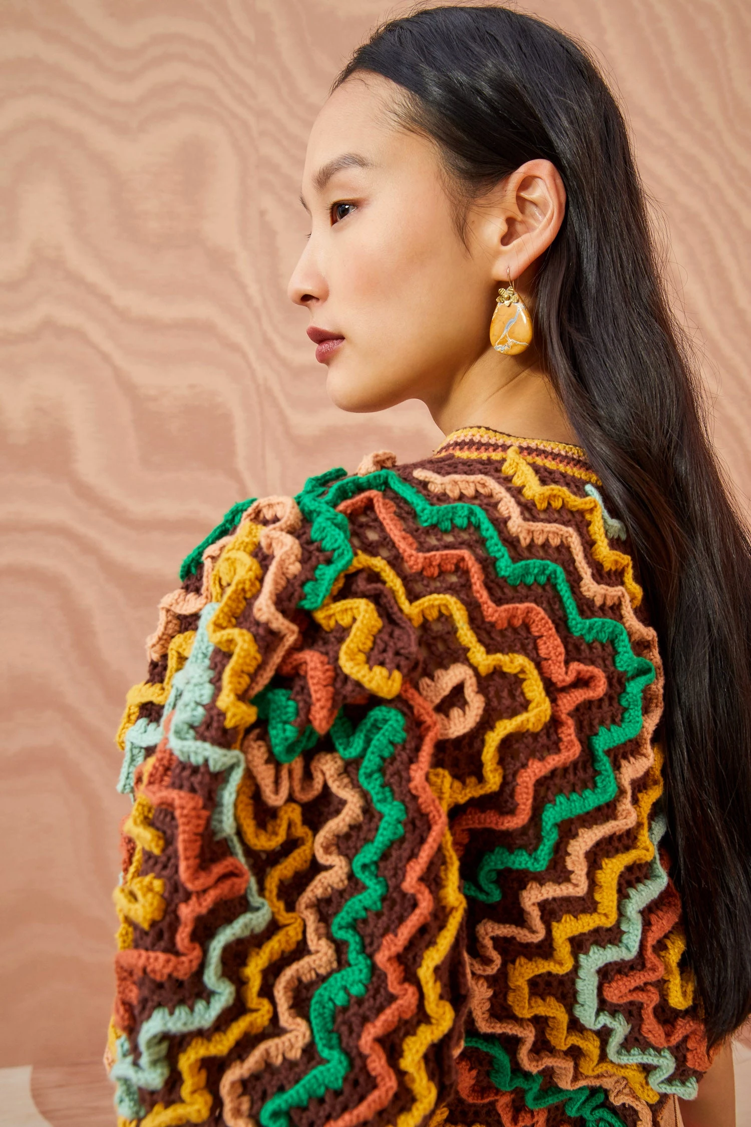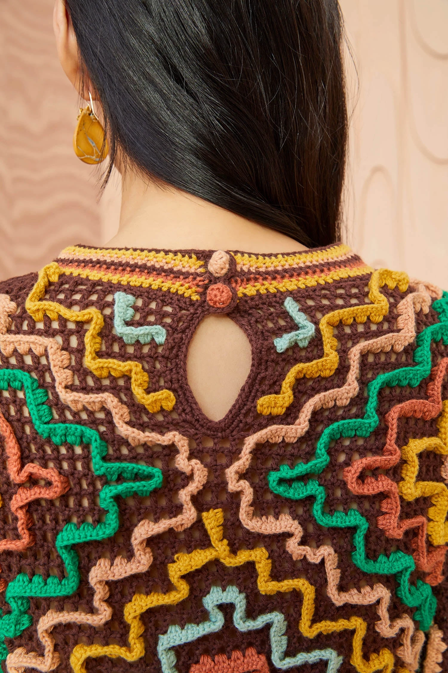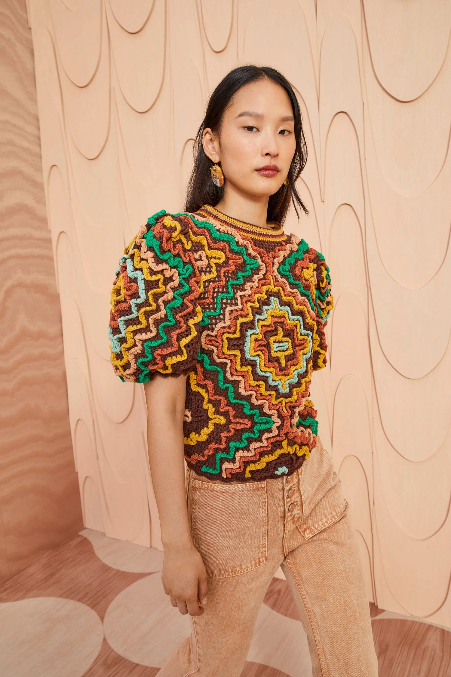 Handmade by our longtime artisanal partners in Peru, the Kalila Top is a gorgeous knit with strips of colorful crochet pieced together to create an intricate geometric pattern. This vivacious yellow, brown, and green top features beautiful short puff sleeves and fastens with a buttoned keyhole at the back.