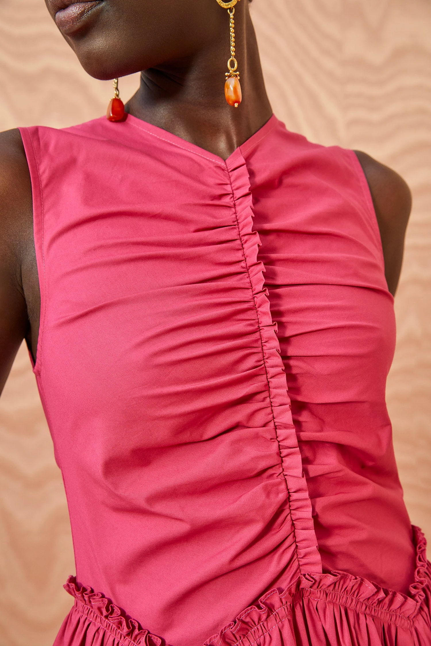 The Mimi Dress is made from our signature cotton poplin in a gorgeous shade of rosebud pink. This sleeveless midi dress features delicate ruching that trails along the bodice and waist and unfulrs to a full A-line skirt. It is finished with a center-back zipper.