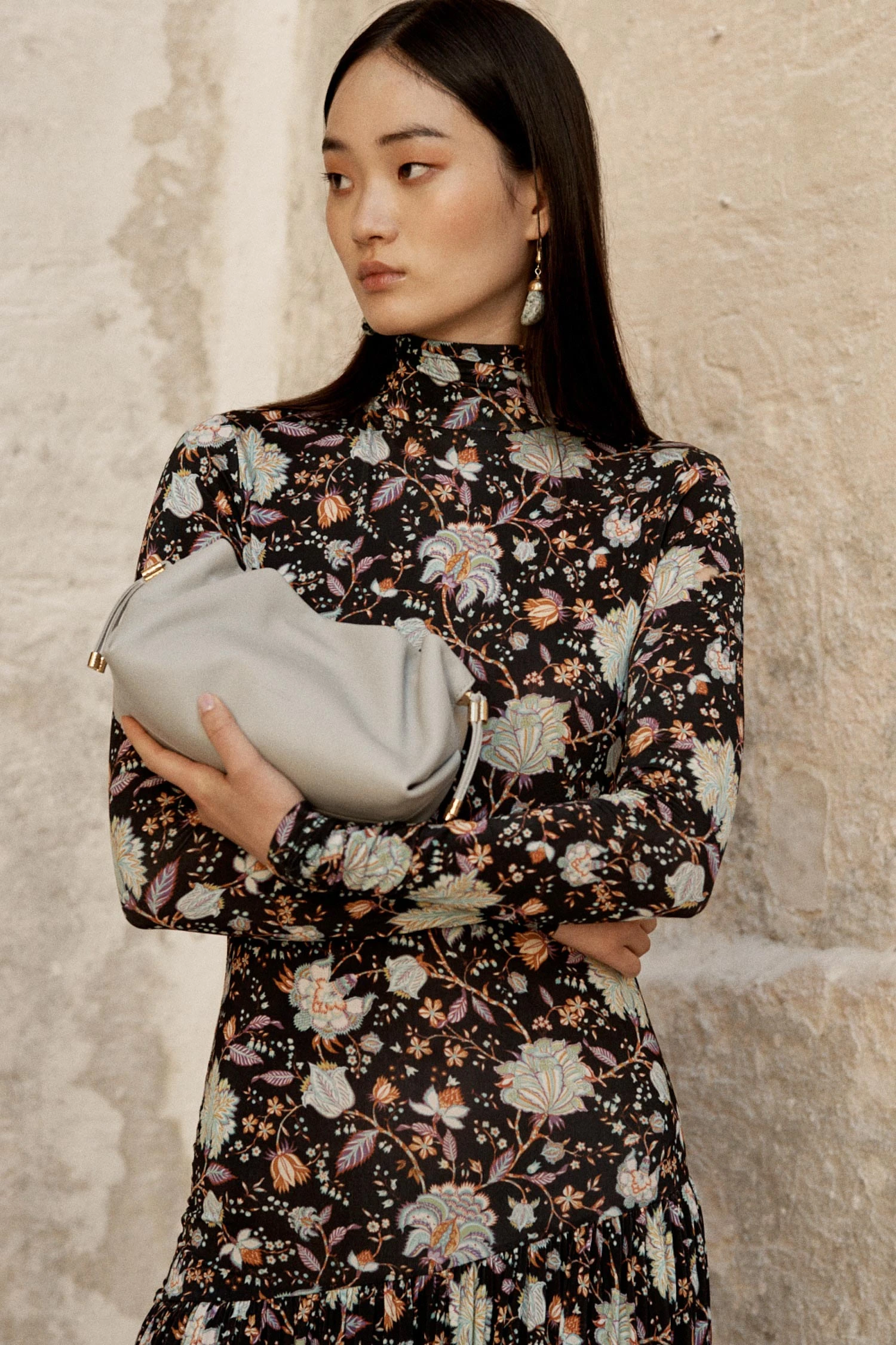 The Remy Mini Handbag is cut from supple leather in a lovely slate-blue. This bag can be worn as a crossbody when styled with the long strap or as a hand-held clutch. This bag is softly gathered at the top opening when the drawstring is pulled tight at the sides. It has an interior magnet closure.