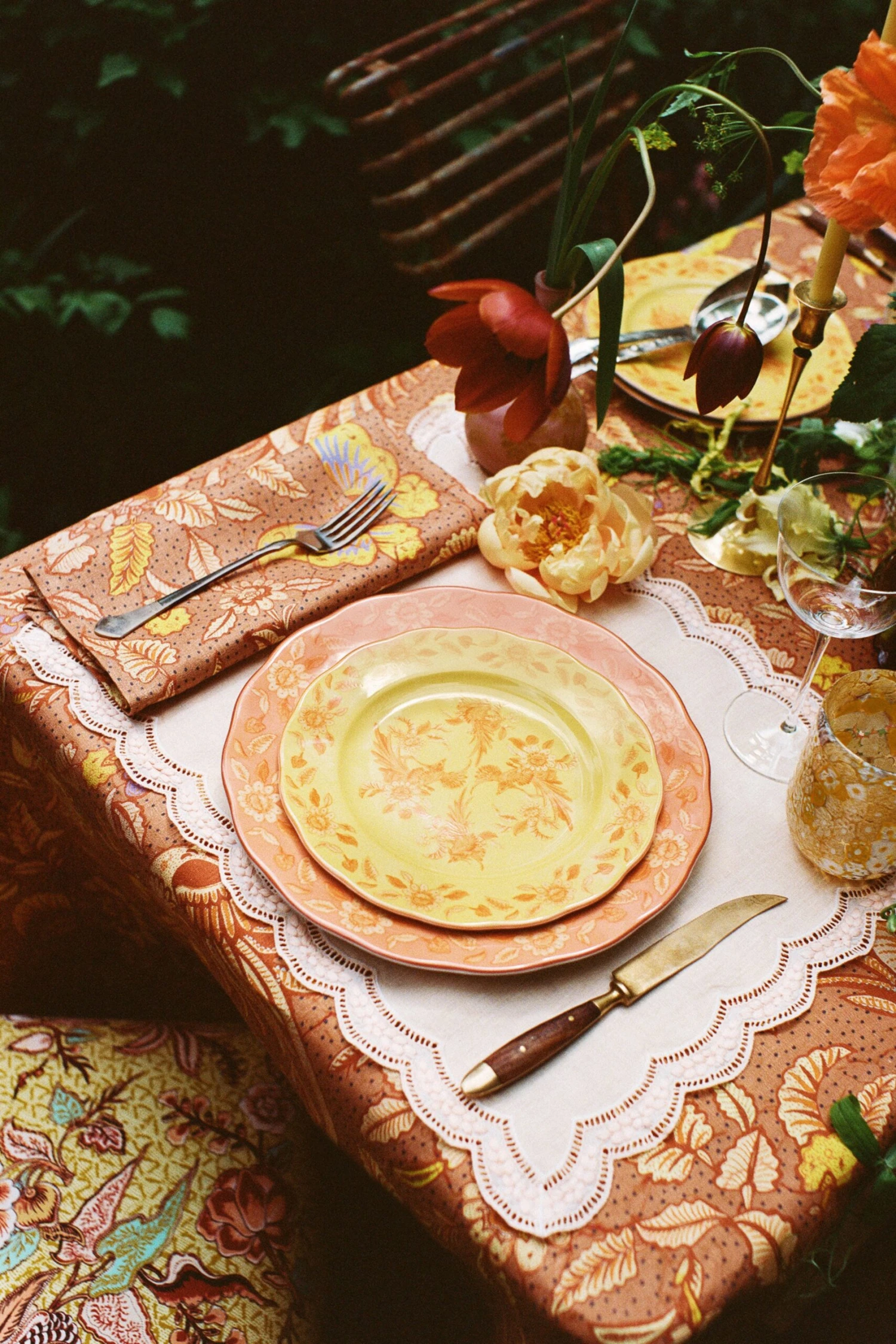 Inspired by the joyful spirit of summer, the Ulla Johnson x Cabana capsule sets the stage for unforgettable alfresco dining experiences. This linen placemat is crafted in Tuscany, hand-dyed in a warm, blush color and embellished with a scalloped embroidered floral border. This capsule marks Ulla’s first foray into home with a tabletop collection of elegant linens, porcelain dinnerware, Murano glassware and home pieces, all of which beautifully reflect the merging of our two worlds.