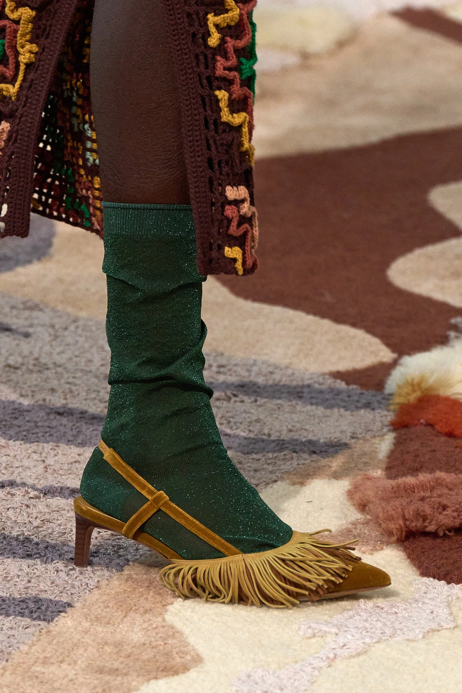 As featured in Look 9, 13, 29, and 53 of our Autumn/Winter ’23 Runway Show, the Shira Fringe Sling Back is a true favorite of this latest collection. Designed with a straight kitten heel shape and a sling-back strap, this shoe is wearable while maintaining intrigue with fine leather fringe outlining the toe.