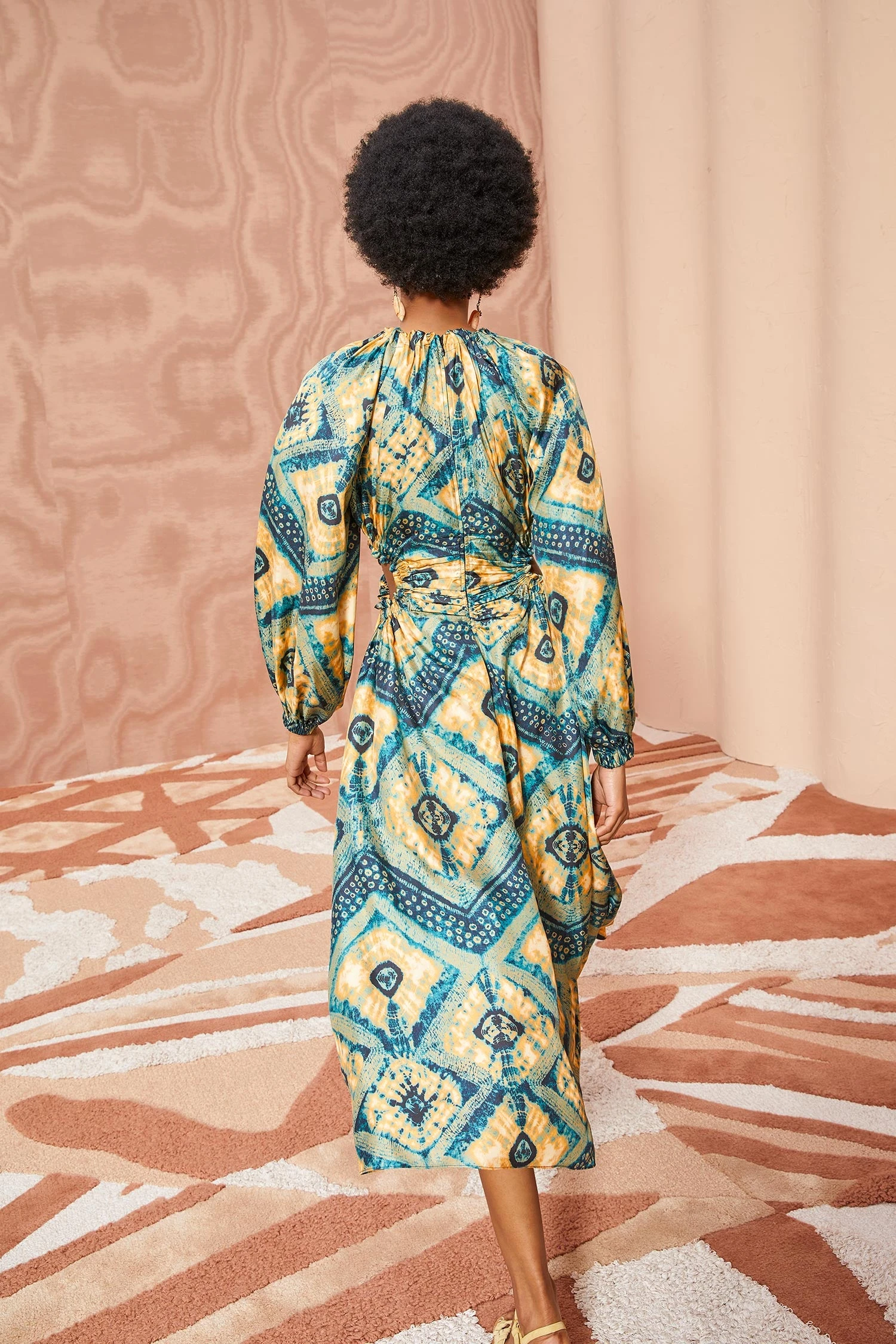 As featured in Look 10 of our Pre-Fall ’23 Lookbook, the Tulia Dress is made of silk twill that has been printed in a blue and cream diamond shibori pattern. This flattering midi dress has stunning ruched details along the neckline and keyhole cutouts at the sides. It features billowing sleeves and is finished with a center-back zipper closure.