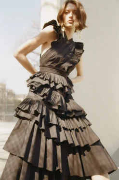 The Vesna Dress is a short-sleeved black mini dress crafted from our signature crushed plisseĢ satin. This perfect party dress is defined by ruffled layers that adorn the sleeves and skirt, which is mirrored by a gorgeous ruffle detail at the neck that is completed with a delicate tie. Finished with a side-seam zipper.
